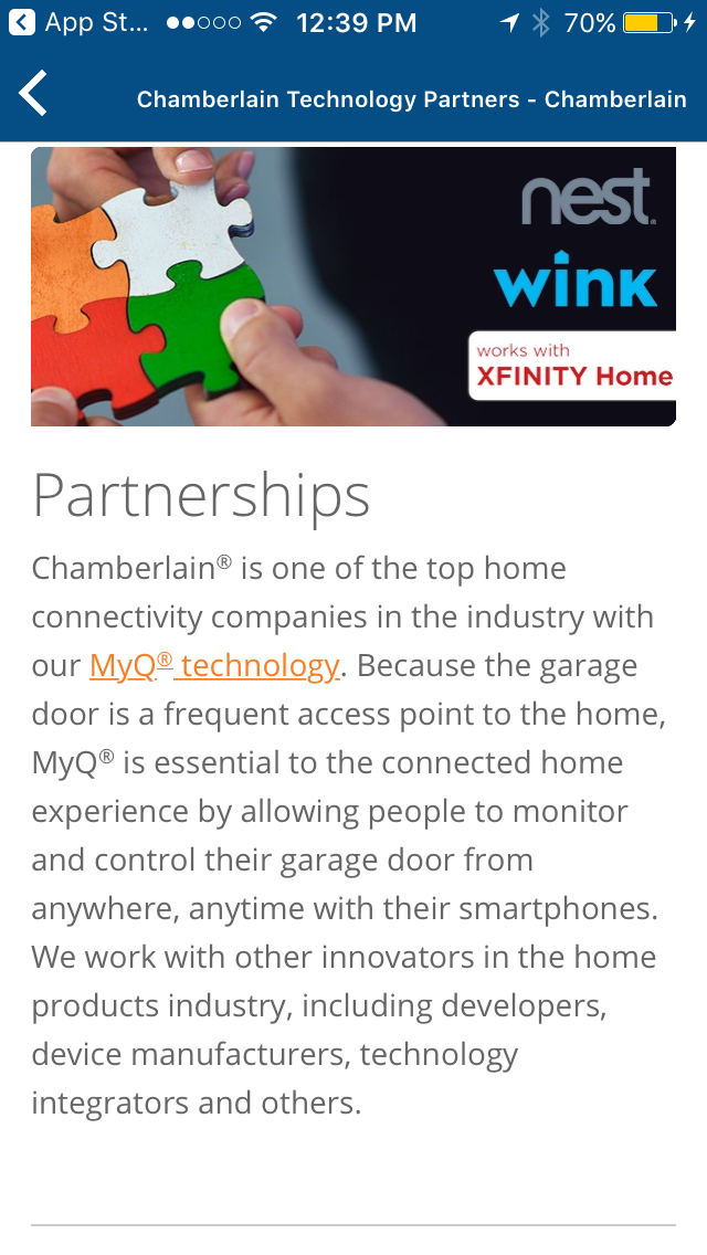 One of the best features of Chamberlain's MyQ is its compatibility with multiple garage door openers. Compatibility is critical and essential to have when building a smart home. Products must be able to speak to each other to function properly and not many do. This is what frustrates many consumers when they buy smart home devices. Devices don't talk to each other because of the different wireless protocols manufacturers built into the devices — and consumers are unaware of the connectivity needed to operate them.