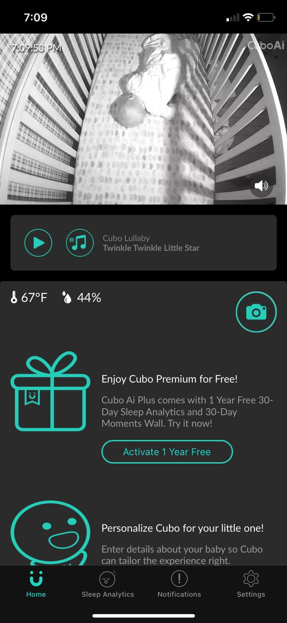 The most essential feature in the Cubo AI app is its sleep analytics. Cubo AI records a baby sleeping in its crib, and also records events, like how many times a parent went in and checked on the baby or when a baby cried or woke up from a nap. The video is then placed in a timeline which can be watched — but a plan is needed if someone wants to go back more than 18 hours. Cubo offers two plans: Cubo AI Plus and Cubo AI Plus with U-Premium.